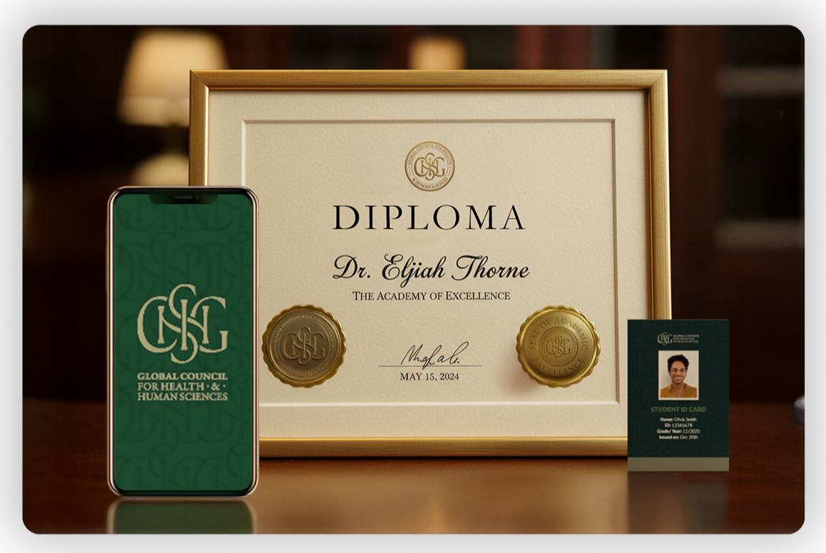 Al sumarte, recibirás las credenciales oficiales que materializan tu pertenencia a la red global GC-HHS. Esta es una documentación desarrollada para proyectar autoridad en cada etapa de tu carrera.